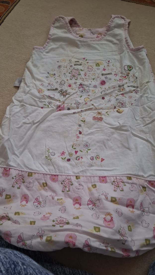 Pastel pembe renkte, yumuşak sentetik kumaştan yapılmış nakışlı çocuk uyku tulumu.