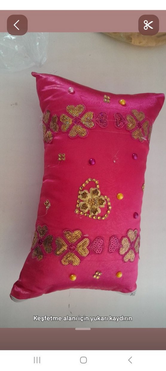 Renkli nakışlı çiçek ve kalp desenleri ile süslenmiş pembe yastık, küçük boncuk detayları içerir. Mekâna canlılık katar. ️