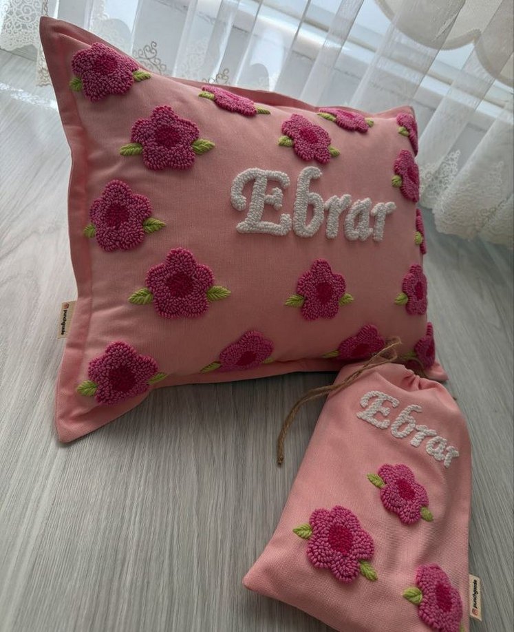 Pastel pembe yastık ve uyumlu kılıf, "Ebrar" ismi ve çiçek nakışlarıyla süslenmiştir. Yumuşak dokulu, zarif çiçek işlemeli.