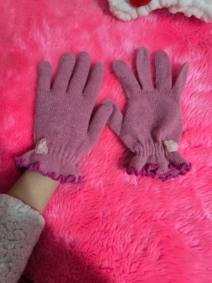 Nakışlı çiçek detaylı, fırfırlı bilek kısmı olan pembe örme kız eldivenleri, renkli bohem tarz sunar.