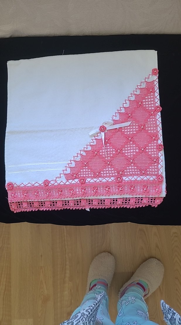 Pastel pembe nakış detayları ve dantel süslemeli sahip havlu