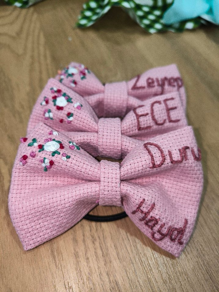 Nakışlı çiçek desenli ve isimli pembe fiyonk toka