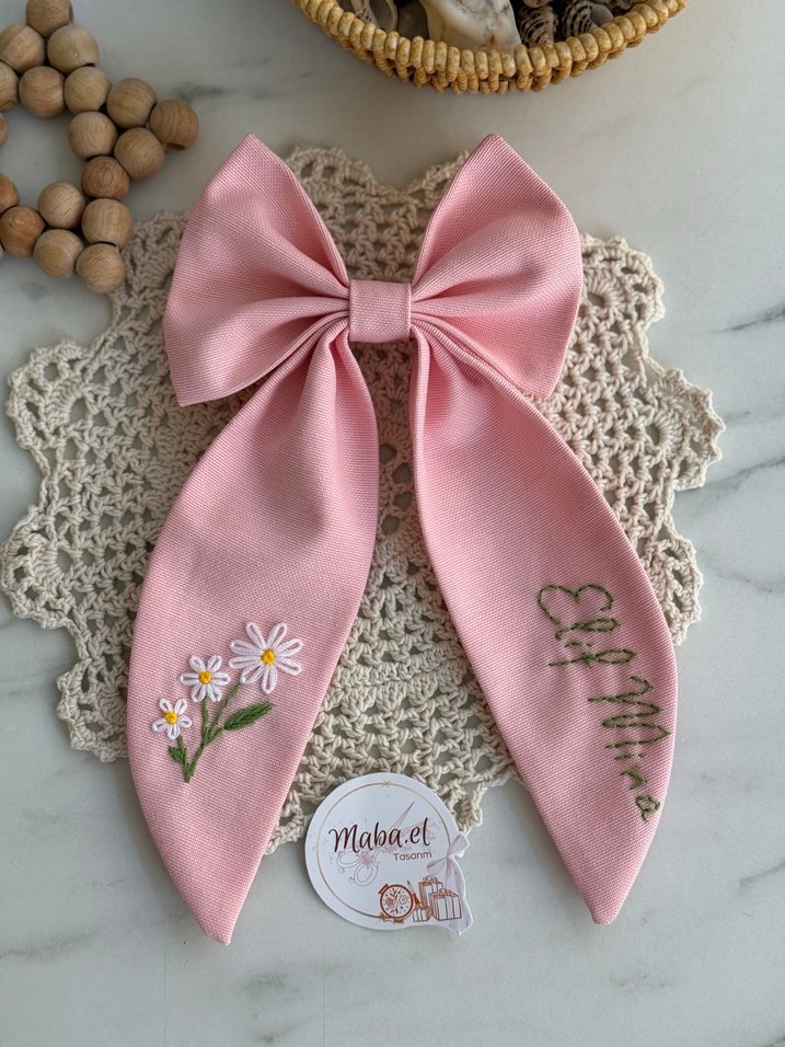 Nakışlı çiçek detaylı ve 'Maba.el' yazılı pastel pembe fiyonk şeklinde bohem tarz saç tokası.