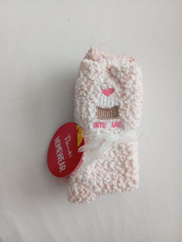 Nakışlı detaylı, yumuşak örme pembe havlu çorabı. "BITE ME" yazılı, ev giyimi için uygundur.