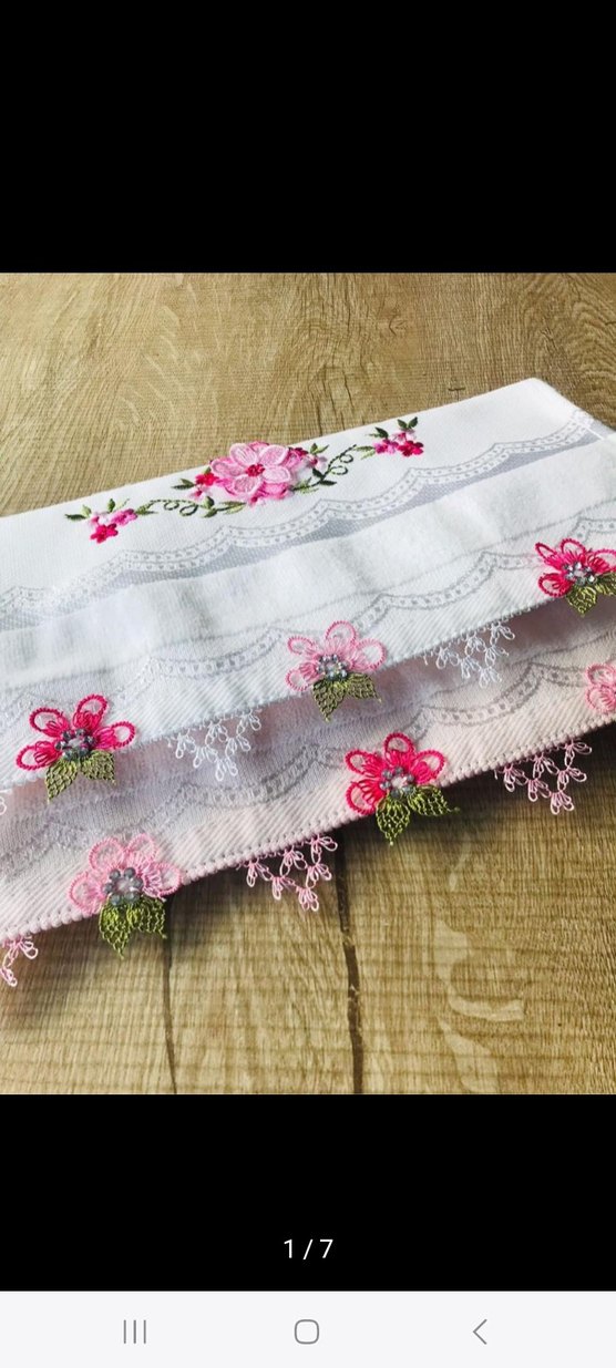 Yumuşak beyaz kumaş üzerinde pastel pembe nakışlı çiçek desenleri ve dantel detayları bulunan klasik tarzda havlu.