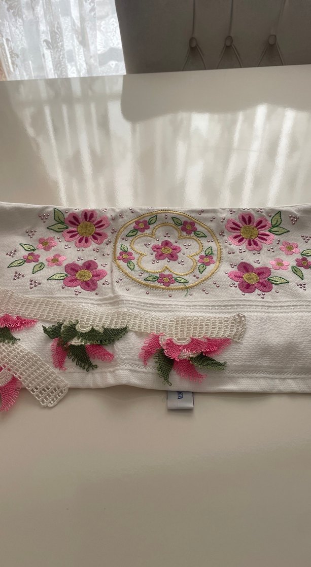 Nakışlı çiçek desenleri ve tığ işi detaylarıyla geleneksel pembe havlu kenarı, yumuşak ve zarif bir görünüm sunar.