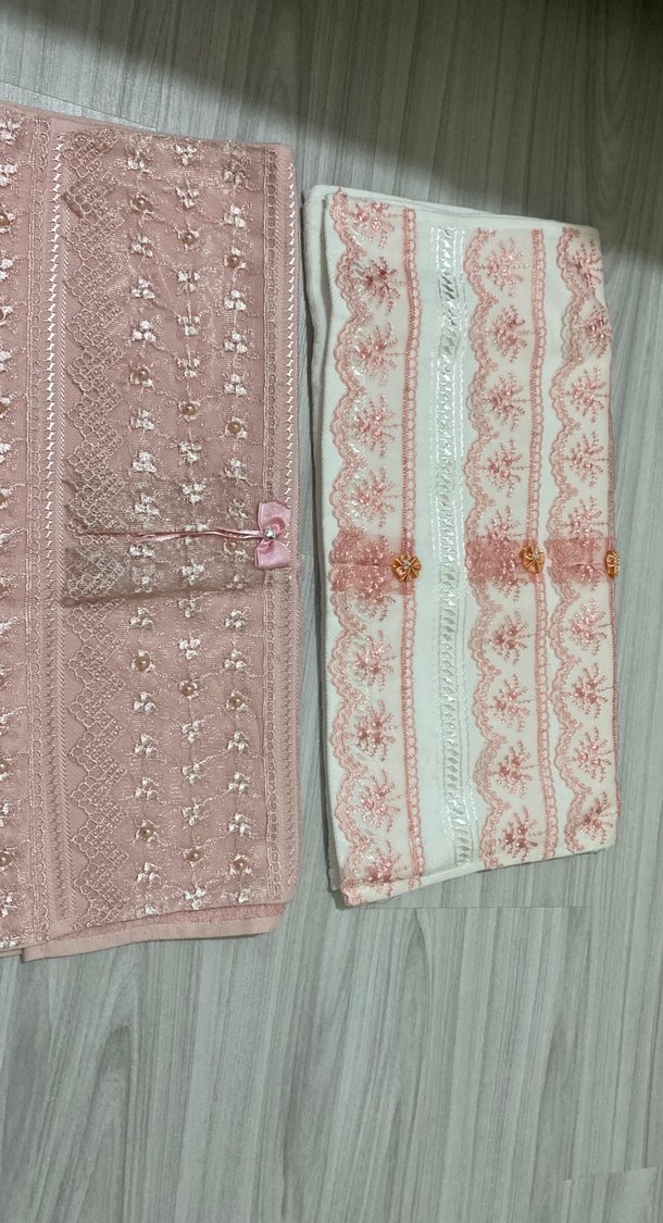 Pastel pembe renkte, nakışlı desenlere sahip, klasik tarzda yumuşak dokulu havlu seti.