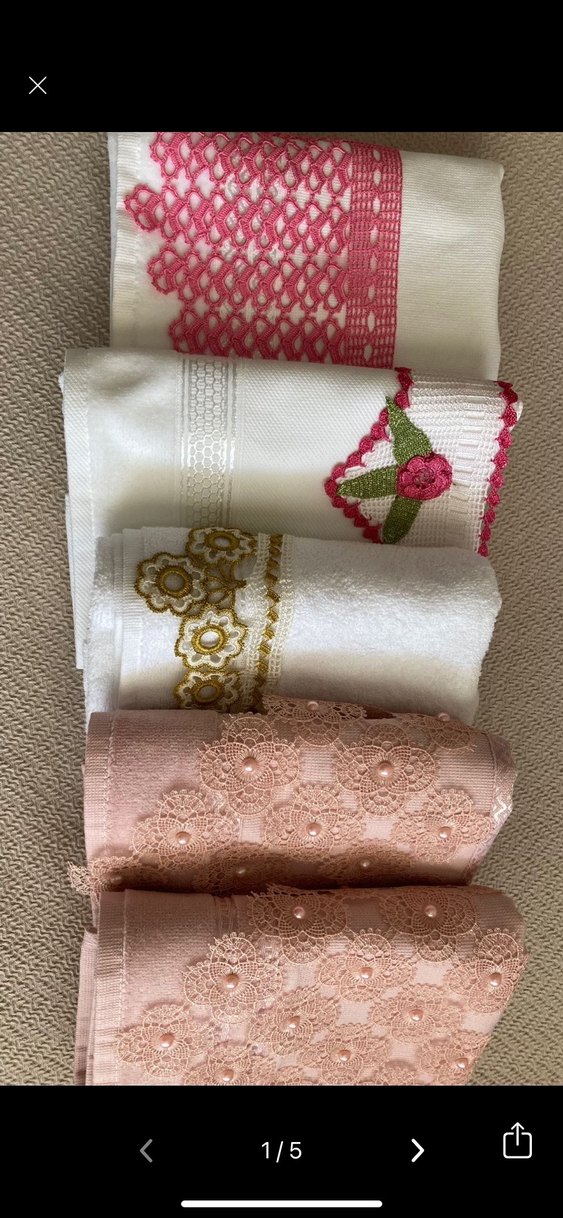 Hafif pembe ve beyaz renklerde, nakışlı çiçek desenleri ve ince dantel detaylarıyla gelen geleneksel tarz havlular. 5.adet adet fiyatıdır isteyen topluda alabilir.