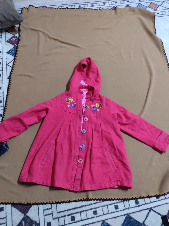 Renkli pembe polar kumaştan yapılmış, düğmeli ve nakışlı detaylara sahip kapüşonlu kız ceketi. Salaş kesim ve kesik yaka stiliyle rahat bir görünüm sunar.