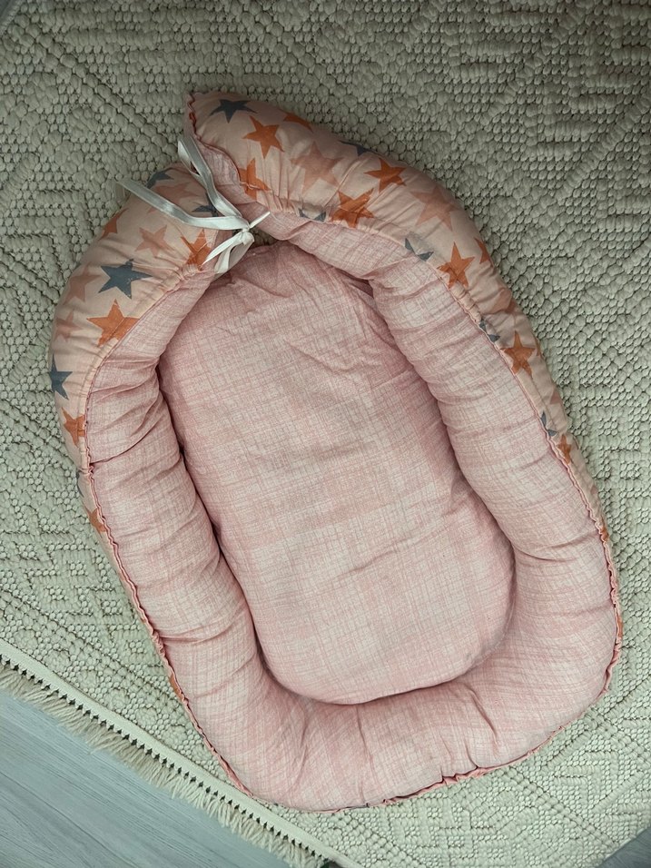 Nakışlı yıldız desenli, yumuşak keten kumaştan yapılmış pastel pembe bebek uyku yatağıdır.