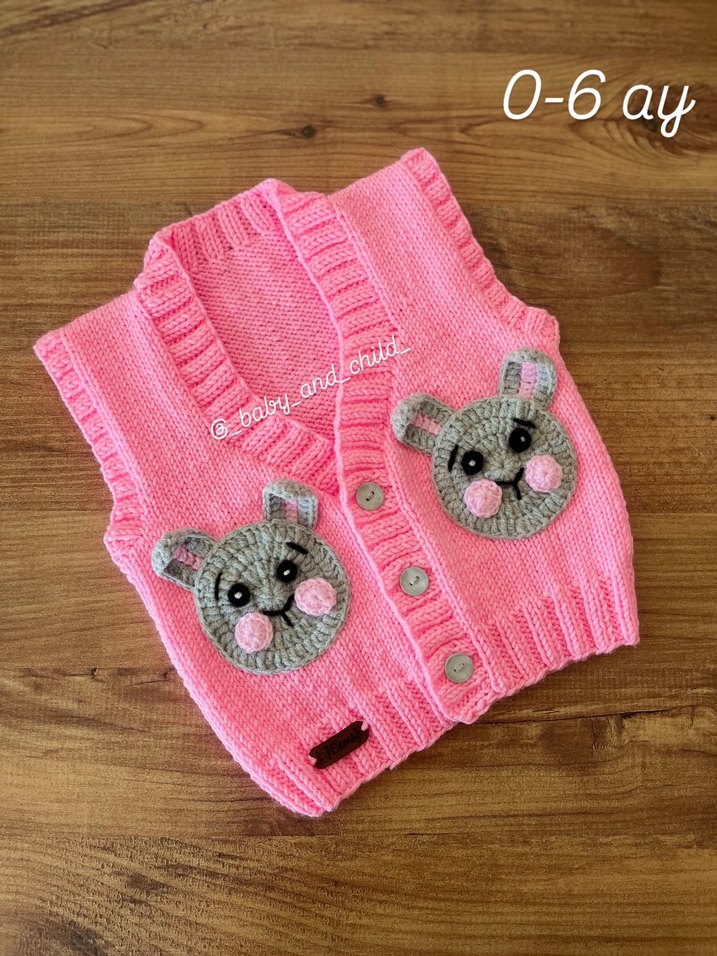 0-6 ay kız bebekler için pembe, nakışlı, örgü, kolsuz yelek. Rahat ve bol kesim, sokak stiline uygun.