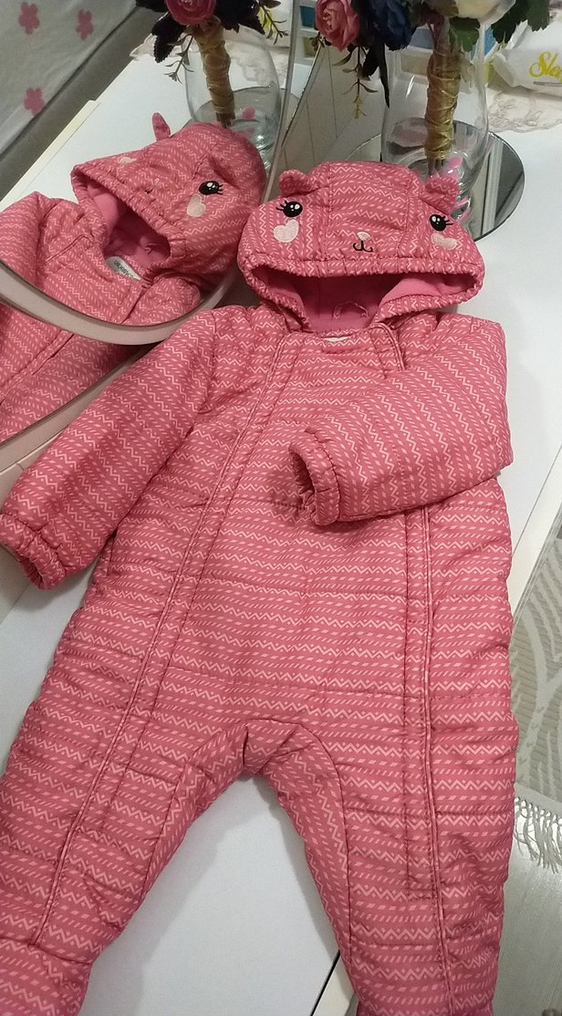 Renkli pembe kız bebek tulumu, nakışlı detaylar ve kesimli yaka ile örme dokudadır. ❄️