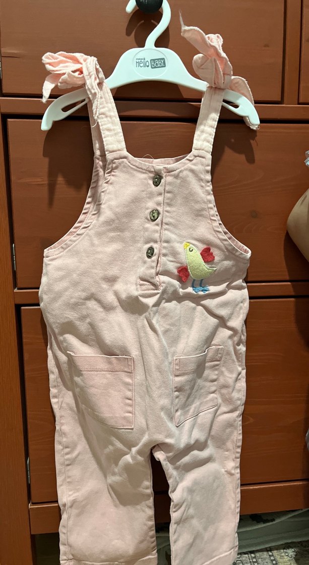 Düğmeli, nakışlı kuş detaylı pembe pamuklu askılı tulum. Rahat oturuşlu, street wear tarzında kolsuz model. Birkaç kez giyildi