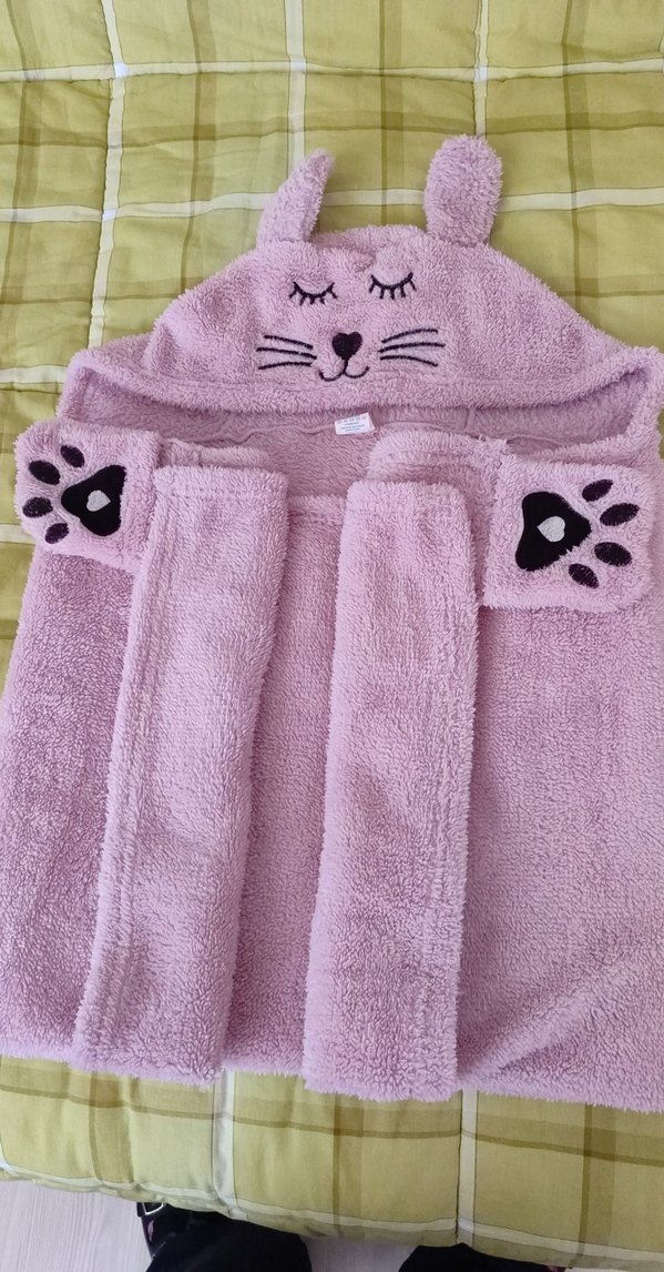 Yumuşak kumaştan yapılmış, kapüşonunda nakışlı kedi yüzü ve kollarında pati desenleri bulunan pembe kız çocuk bornozu yada battaniye