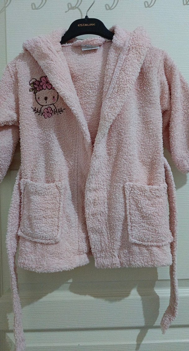 Yumuşak ve sıcak pembe kız çocuk bornozu, nakışlı detaylara ve iki ön cebe sahiptir. Rahatlık için tüylü kumaştan üretilmiştir.