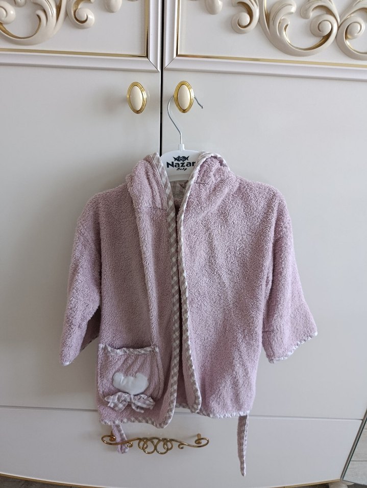 Pastel pembe renkli, yumuşak ve sıcak kumaştan yapılmış, kapüşonlu ve nakışlı kız çocuk bornozu.