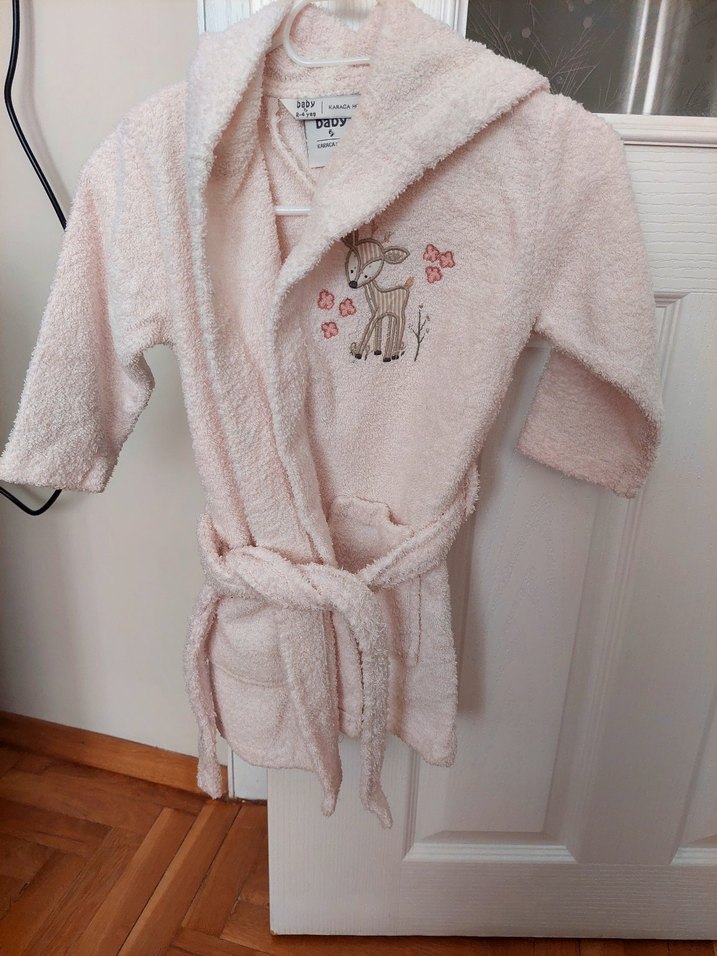 Yumuşak ve sıcak kumaştan yapılmış, kapüşonlu ve kemerli pembe kız çocuk bornozu. Üzerinde nakışlı geyik ve çiçek deseni bulunur.