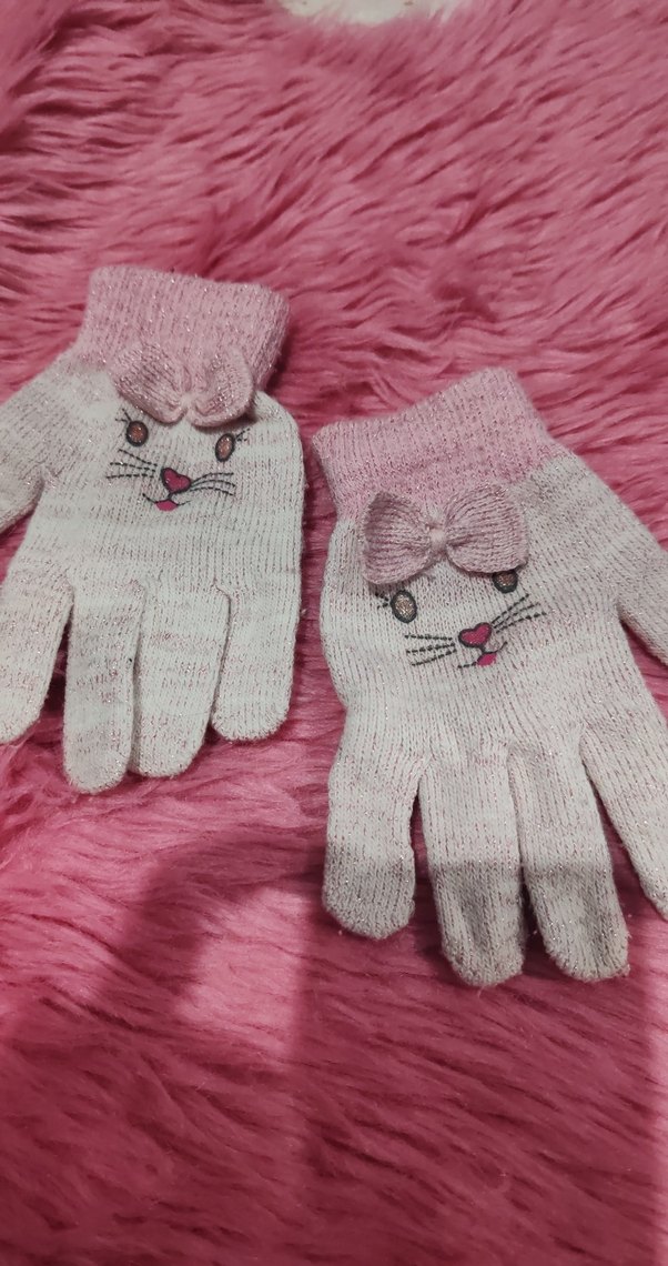 Nakışlı kedi yüzü ve fiyonk detaylı, pastel pembe örme kız çocuk eldiveni, şık ve rahat kullanım sağlar.