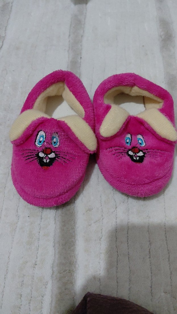 Nakışlı tavşan yüzü detaylı, yumuşak ve sıcak kumaştan yapılmış renkli pembe kız çocuk ev terliği.