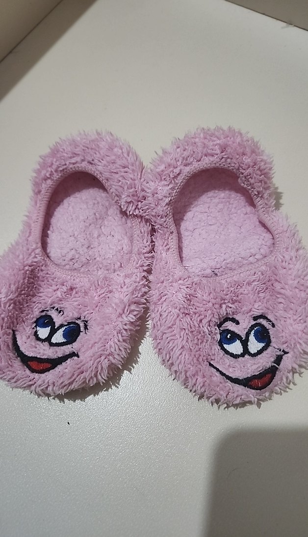 Renkli nakışlı pop kültür figürleriyle süslenmiş, yumuşak pembe kız çocuk ev terliği. Örgü dokusu, rahat ve bohem bir hava katıyor.