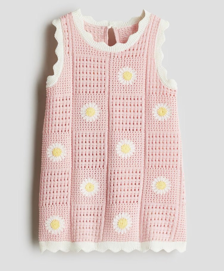 Nakışlı papatya desenli, pembe renkli, kolsuz örgü elbise. Yuvarlak yaka ve bol kesimiyle rahat bir bohem tarz sunar.