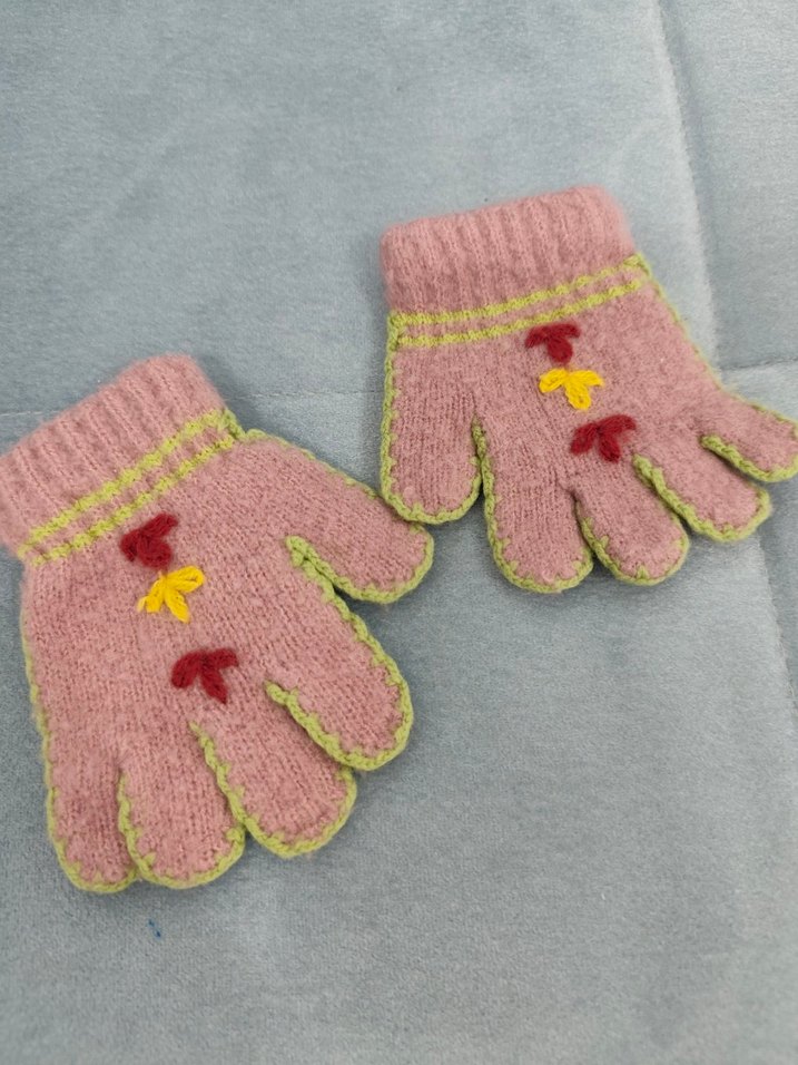 Renkli pembe örgü kız çocuk eldivenleri nakışlı çiçek detaylarına ve yumuşak dokusuna sahiptir. Serin günler için uygundur.