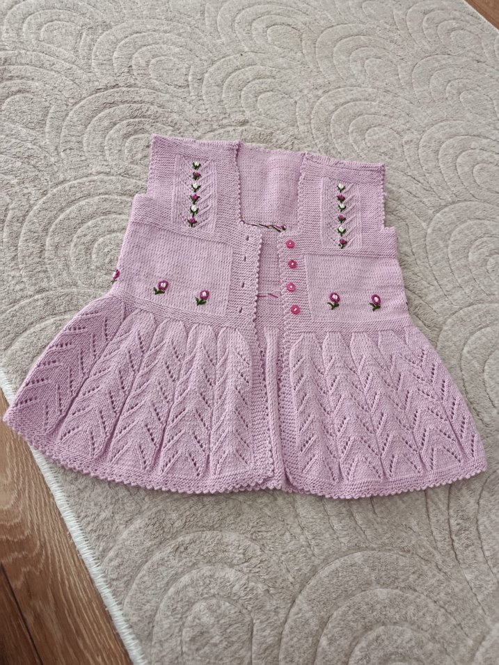 Nakışlı çiçek desenleri ve bohem tarzıyla pembe, kolsuz örgü kız çocuk yeleği, normal kesim hiç kullanılmadı el emeği