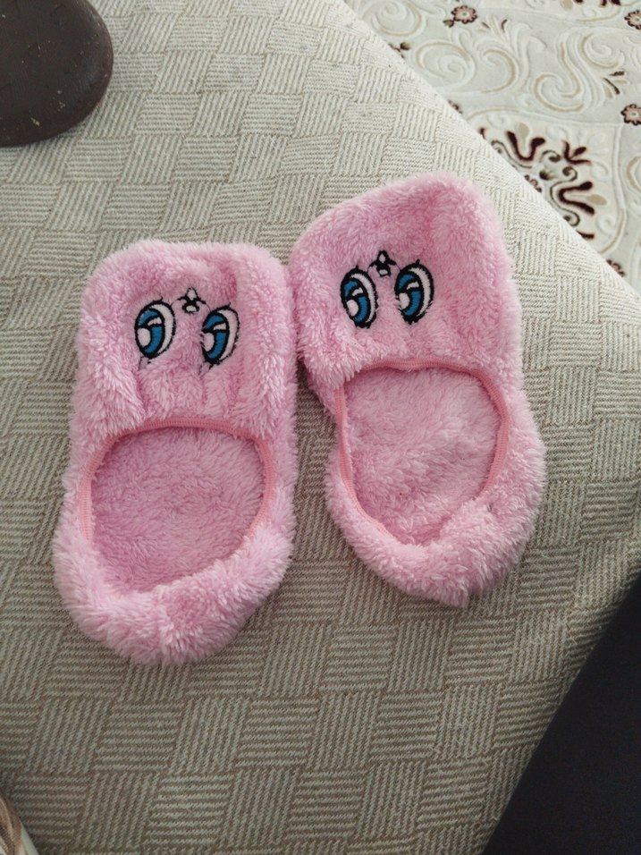 Pastel pembe renkli, nakışlı göz desenli, yumuşak dokulu kız çocuk sıcak terlikler, rahat sokak tarzı için uygundur.
