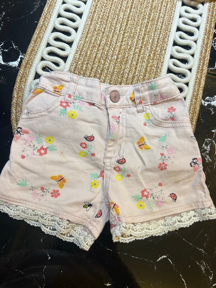 Nakışlı çiçek ve böcek desenleriyle pembe, dantel detaylı, bohem tarzda kız çocuk şortu.