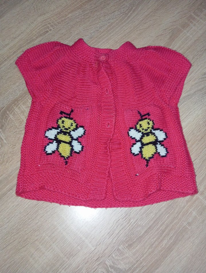 Pembe triko kumaştan, nakışlı arı desenli, bohem tarzda, fitted kesim kız çocuk kolsuz yelek.