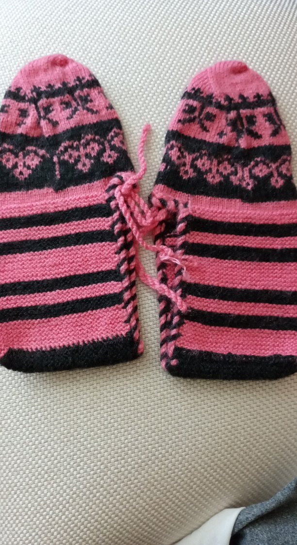 Nakışlı kalp desenleri ve çizgilerle süslenmiş koyu pembe örgü kız patik, ip ile bağlı.