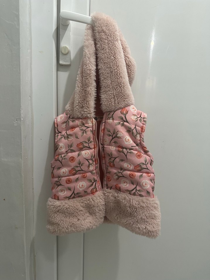 Nakışlı çiçek desenleriyle süslenmiş, pastel pembe renkli, straplez yaka ve kolsuz kız yeleği. Kürklü kapüşon ve etek ucu ile sıcak tutar.