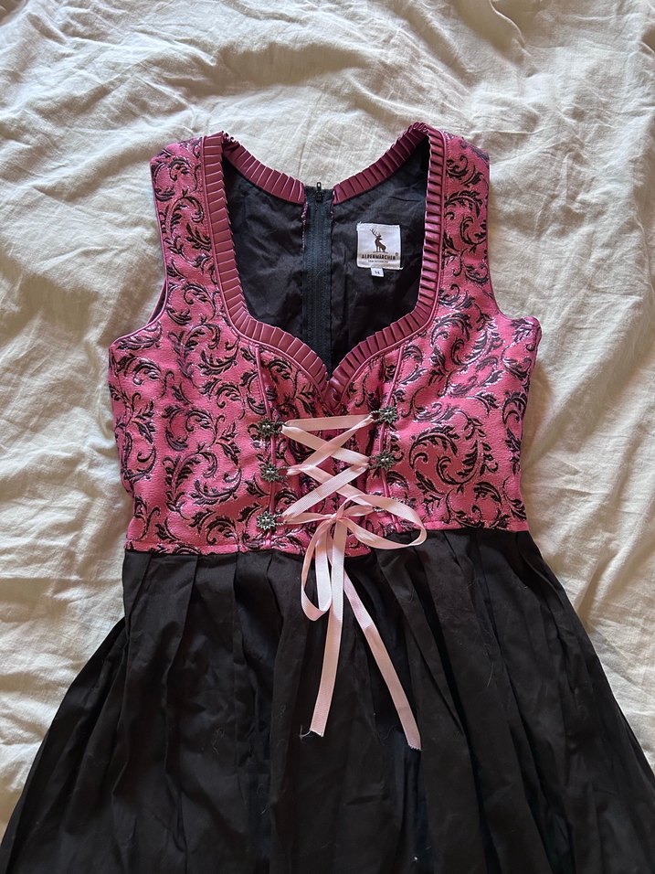 Nakışlı koyu pembe kumaştan, ön kısmı bağcıklı ve uzun boy siyah etekli. Hiç giyimedi Xs- Small beden olur