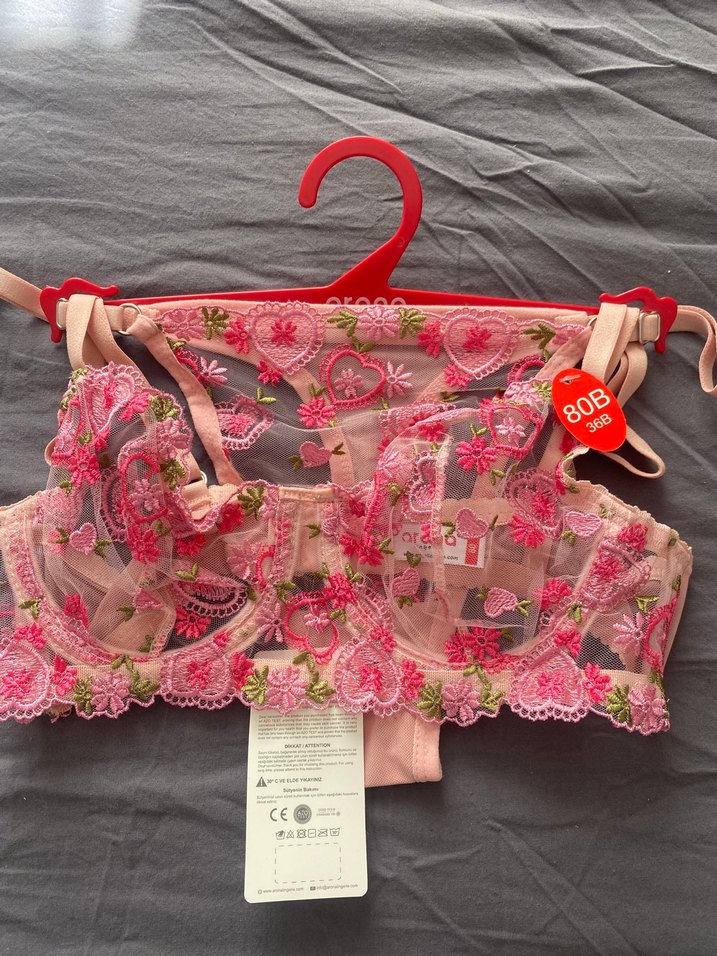 Nakışlı çiçek ve kalp desenleriyle pembe midi uzunlukta, ayarlanabilir askılı bohem Paris tarzı sütyen. bedenler mevcut