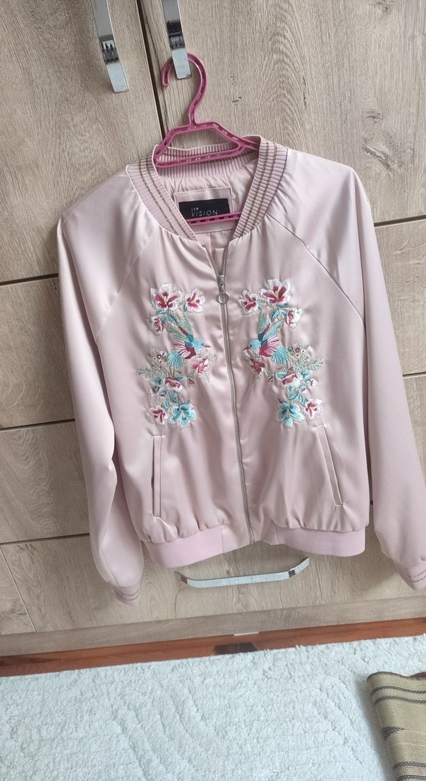 Pastel pembe renkte, nakışlı desenlere sahip, fermuarlı mini kadın ceket. Uzun kollu, salaş kesim ve bisiklet yaka ile günlük kullanıma uygun.