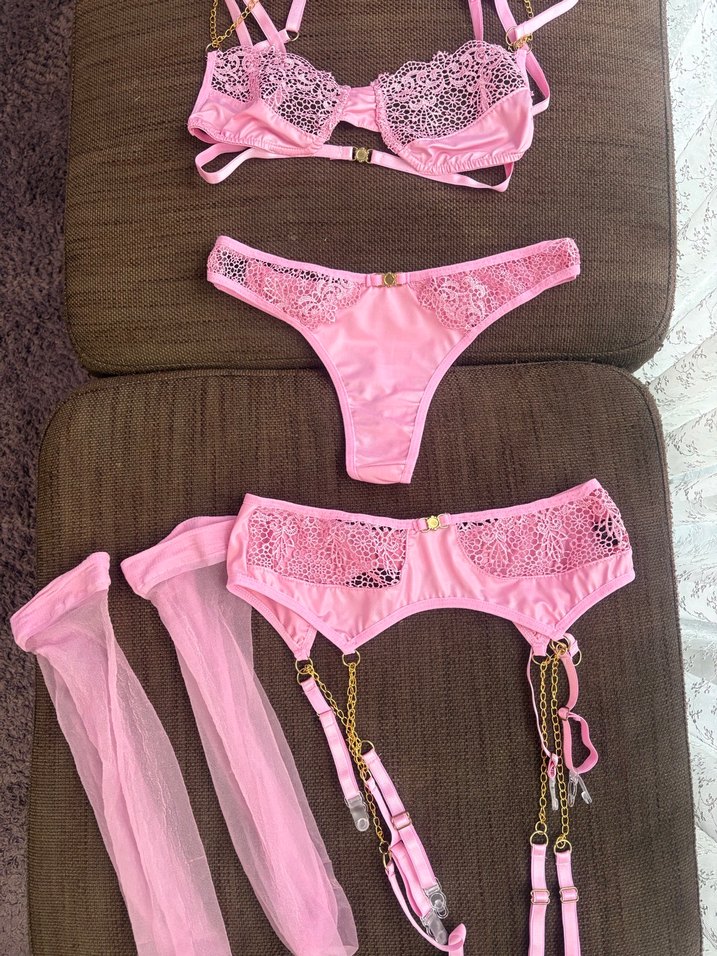 Nakışlı detaylara sahip pembe mini sütyen takımı; kısa süren sütyen, uyumlu tanga, altın zincirli jartiyer çorap içerir.