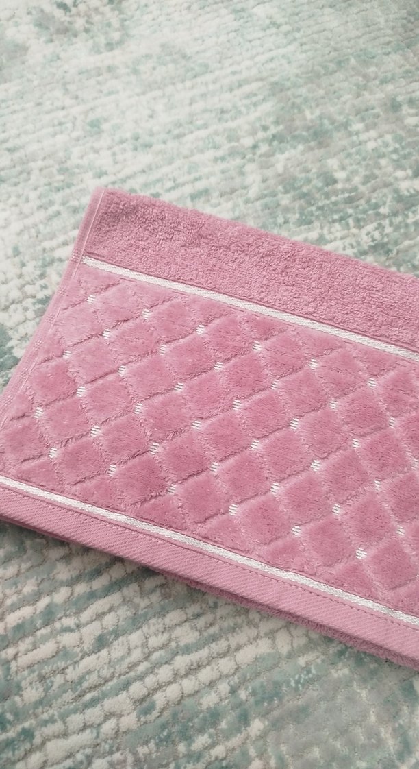Pembe renkte, nakışlı detaylara sahip modern klasik tarzda pastel tonlu havlu. Yumuşak dokulu ve şık tasarımlı.