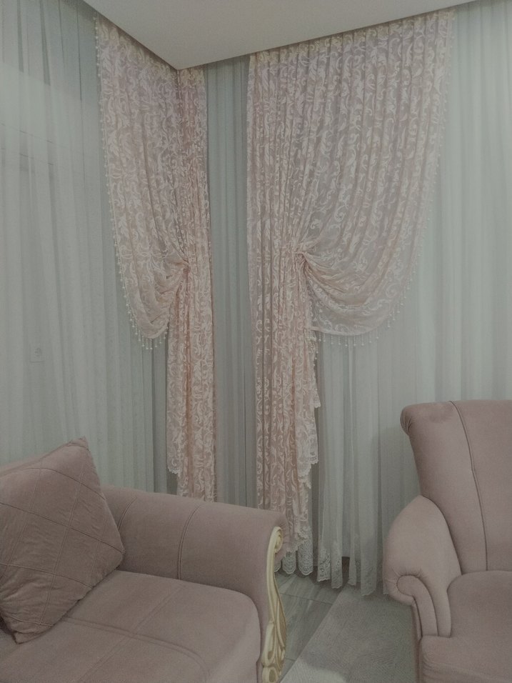4 adet Nakışlı detaylara sahip pastel pembe perdeler, modern klasik tarzda odalara zarafet katıyor.