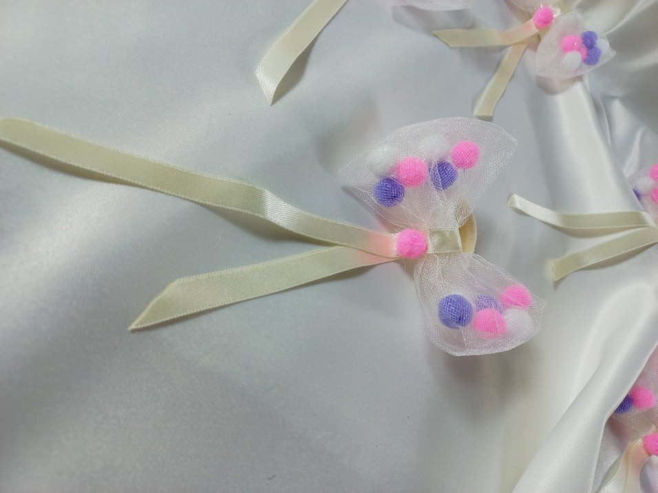 çift.Nakışlı tül fiyonk üzerinde pembe ve mor ponponlar bulunan pastel renklerde, yumuşak kurdeleli çocuk saç bandı. el emeğidir.