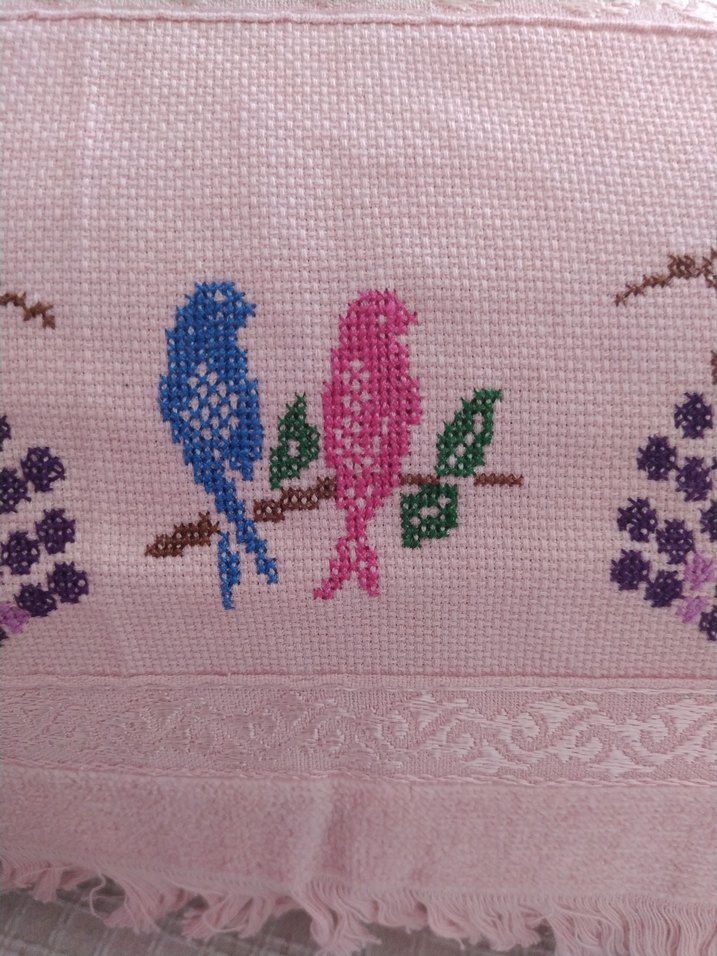 Pastel pembe renkte, nakışlı kuş ve çiçek desenleri bulunan, püsküllü kenarlı geleneksel tarzda mutfak havlusu. ️
