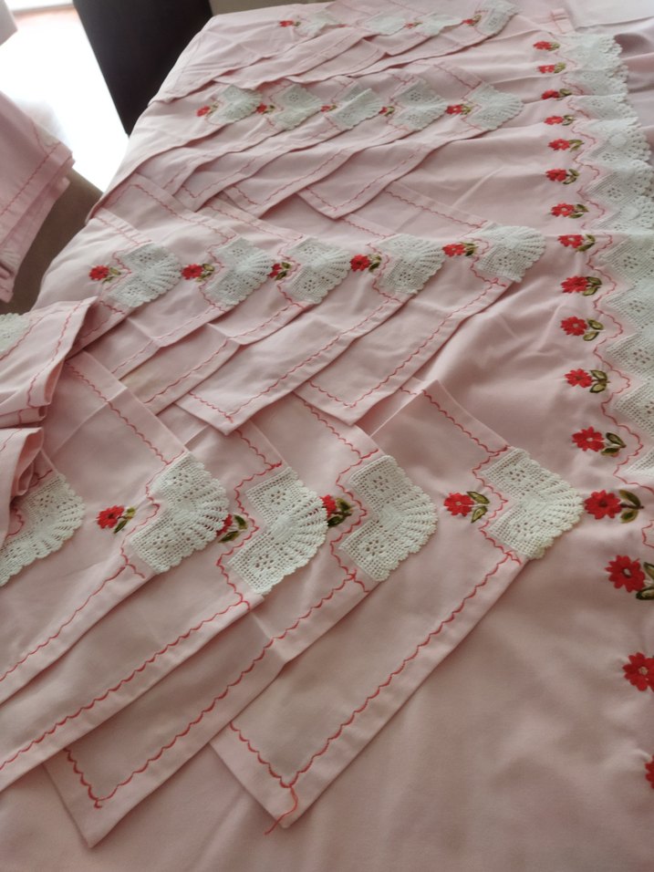 Nakışlı çiçek desenleri ve dantel detaylarıyla pastel pembe mutfak seti, geleneksel tarzda kullanıma uygundur.