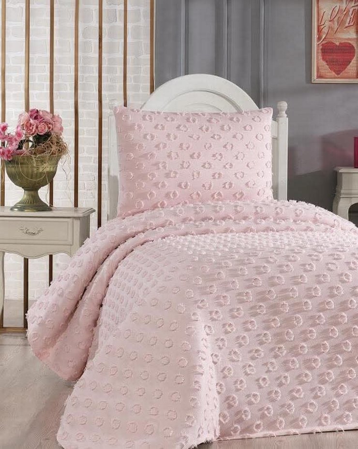 Pastel pembe renkte, ponpon yatak örtüsü yumuşak ve zarif bir doku sunar. Ponpon Tek kisilik 2 parça yatak örtüsü 180×250cm Battal boy