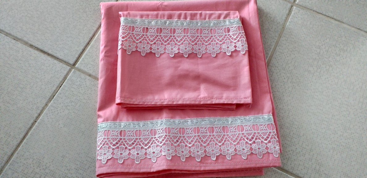 Pastel pembe nevresim ve çarşaf takımı, beyaz nakışlı dantel detaylara sahiptir. Yumuşak ve şık tasarım, konforlu yatak odası için uygundur. ️