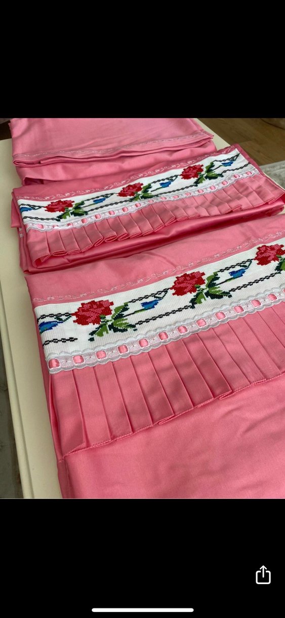 Nakışlı çiçek desenleri ve pile detaylarıyla pastel pembe nevresim ve çarşaf takımı. Yumuşak ve dekoratif yatak örtüsü.