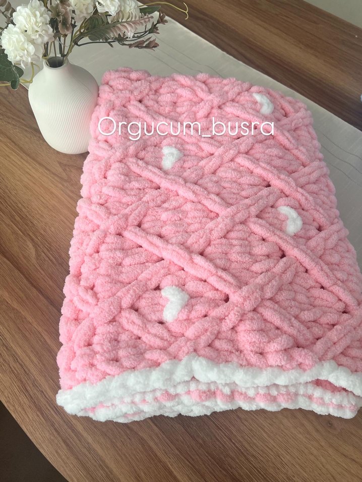 Nakışlı kalp desenli, pastel pembe renkli, yumuşak dokulu örgü çocuk battaniyesi.