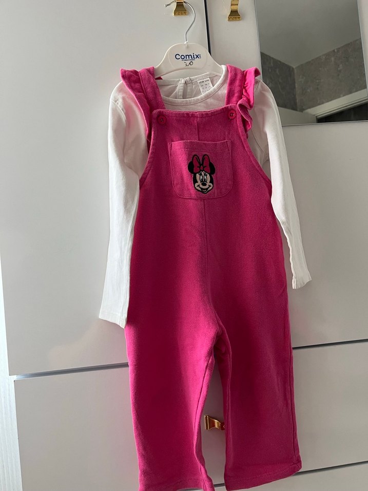 Renkli pembe örgü bebek tulumu, ön cepten nakışlı Minnie Mouse deseni ile dikkat çekiyor. Altında beyaz uzun kollu tişört bulunuyor.