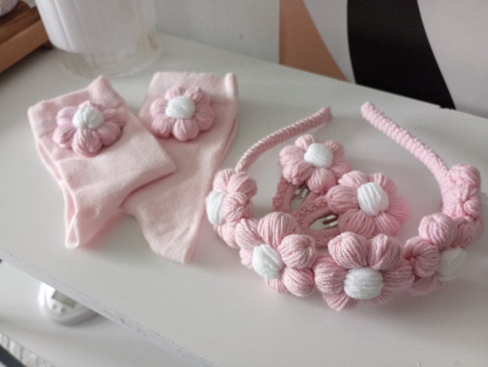 Nakışlı Pembe Örgü Çiçekli Çocuk Saç Aksesuarı