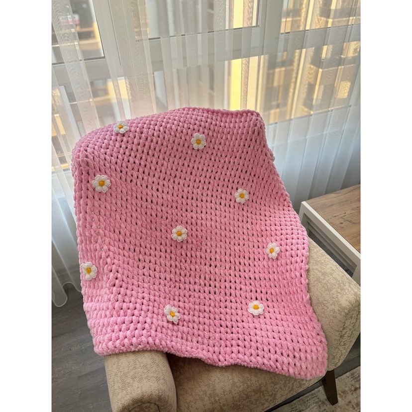 Nakışlı çiçek detaylı, pastel pembe örgü çocuk battaniyesi, yumuşak ve rahat dokudadır.
