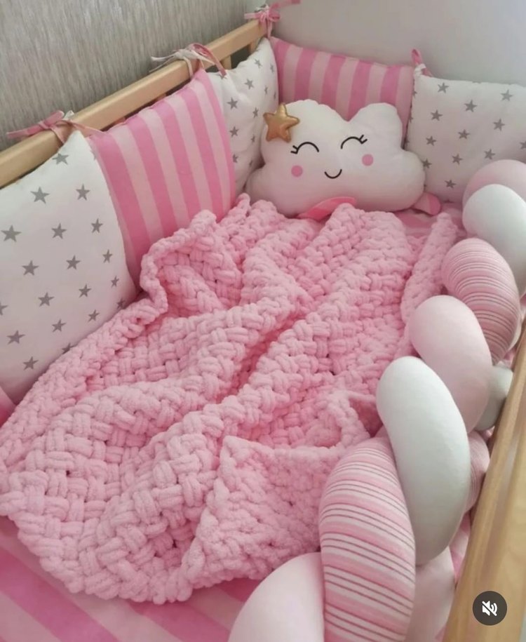 Nakışlı detaylara sahip pastel pembe yumuşak örgü çocuk battaniyesi, rahatlık için ideal.