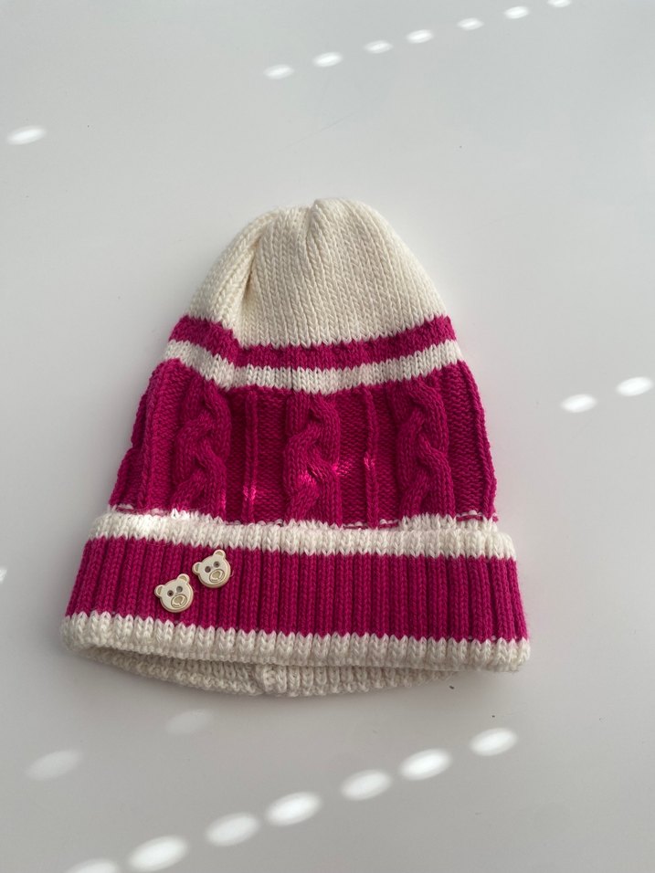 Nakışlı ayıcık detaylı, pembe ve beyaz renklerde örgü çocuk bere. Sıcak ve eğlenceli bir görünüm sağlar.